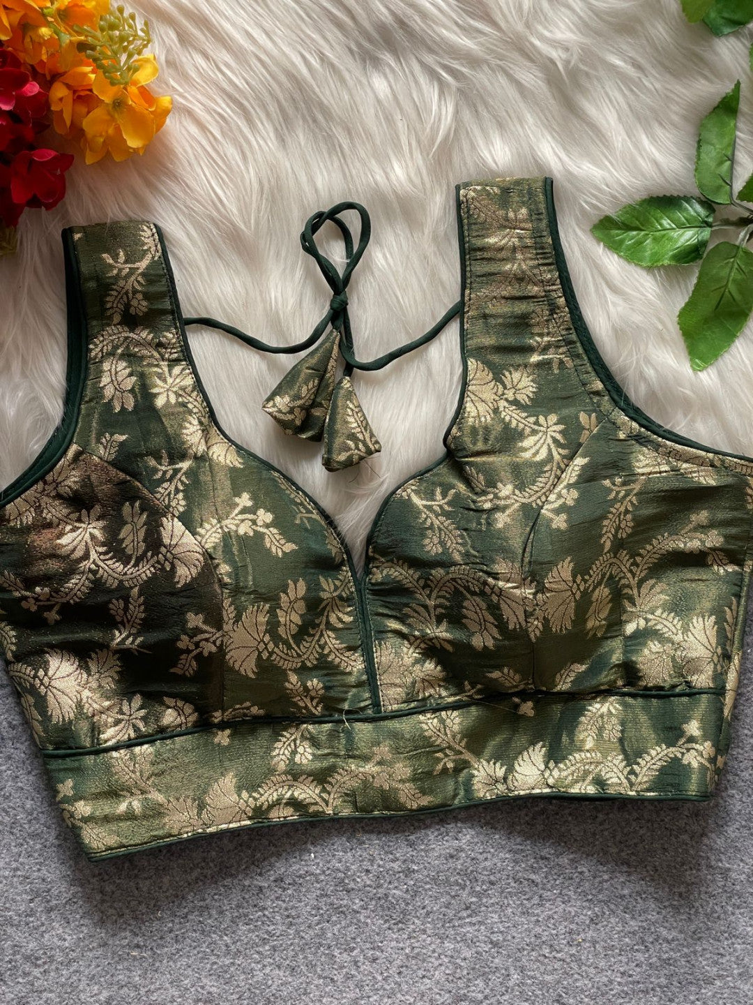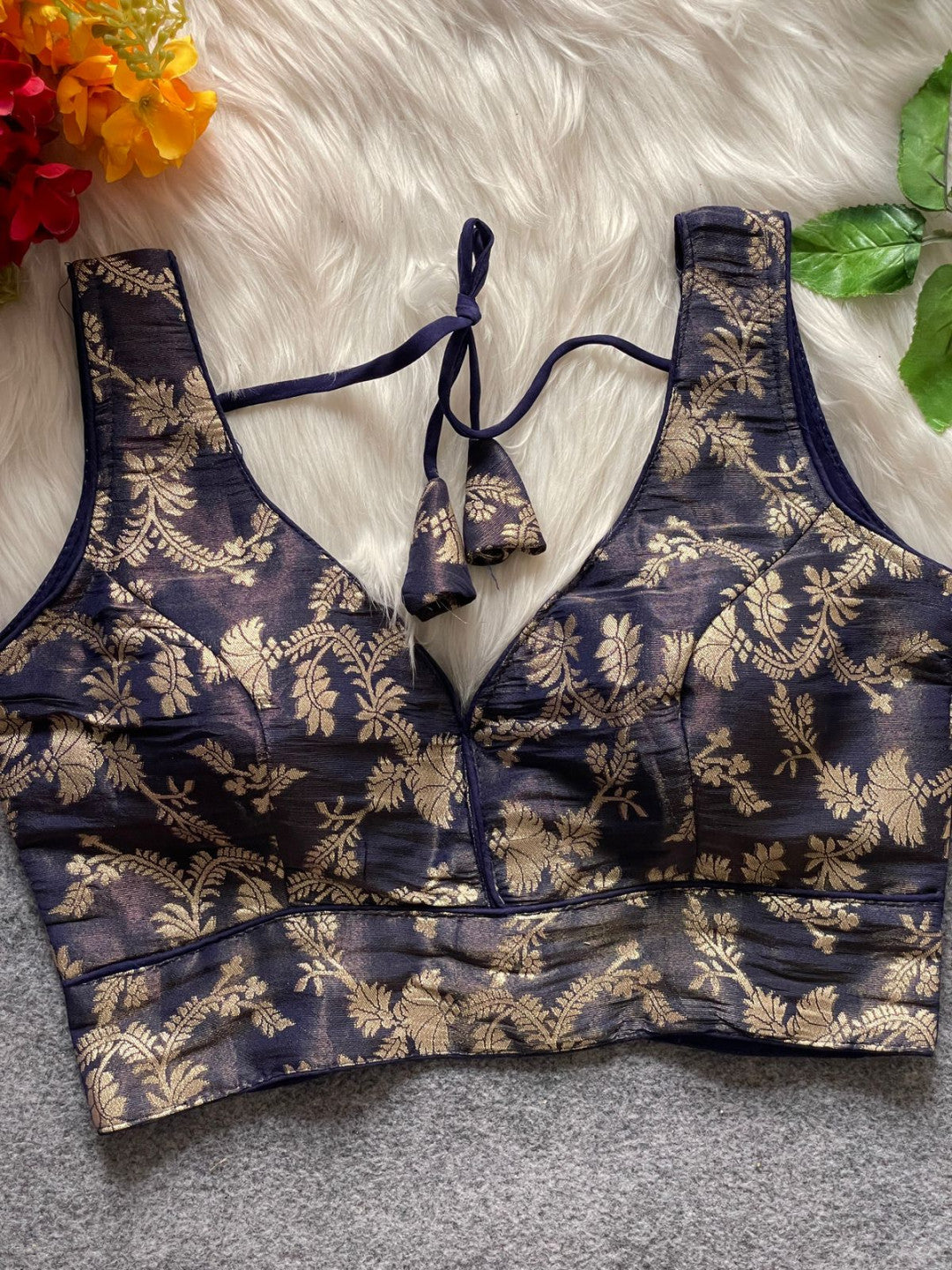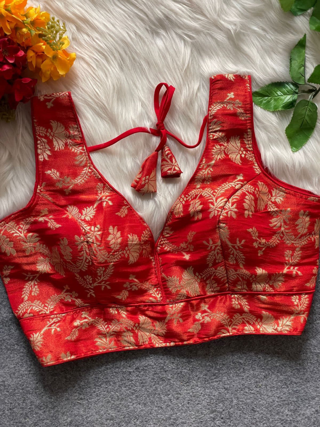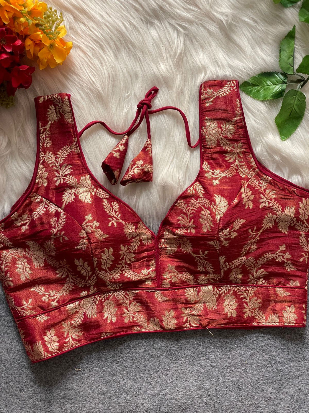 Fabric: Jequard Stitch type: Full stitched Work : Zari work Sleeves size: 10 inch in Side Attached Size: Free size 38 inch ready ulter upto 42 inch Back side: Back with hooks Pattern: V neck Pad: Yes padded.