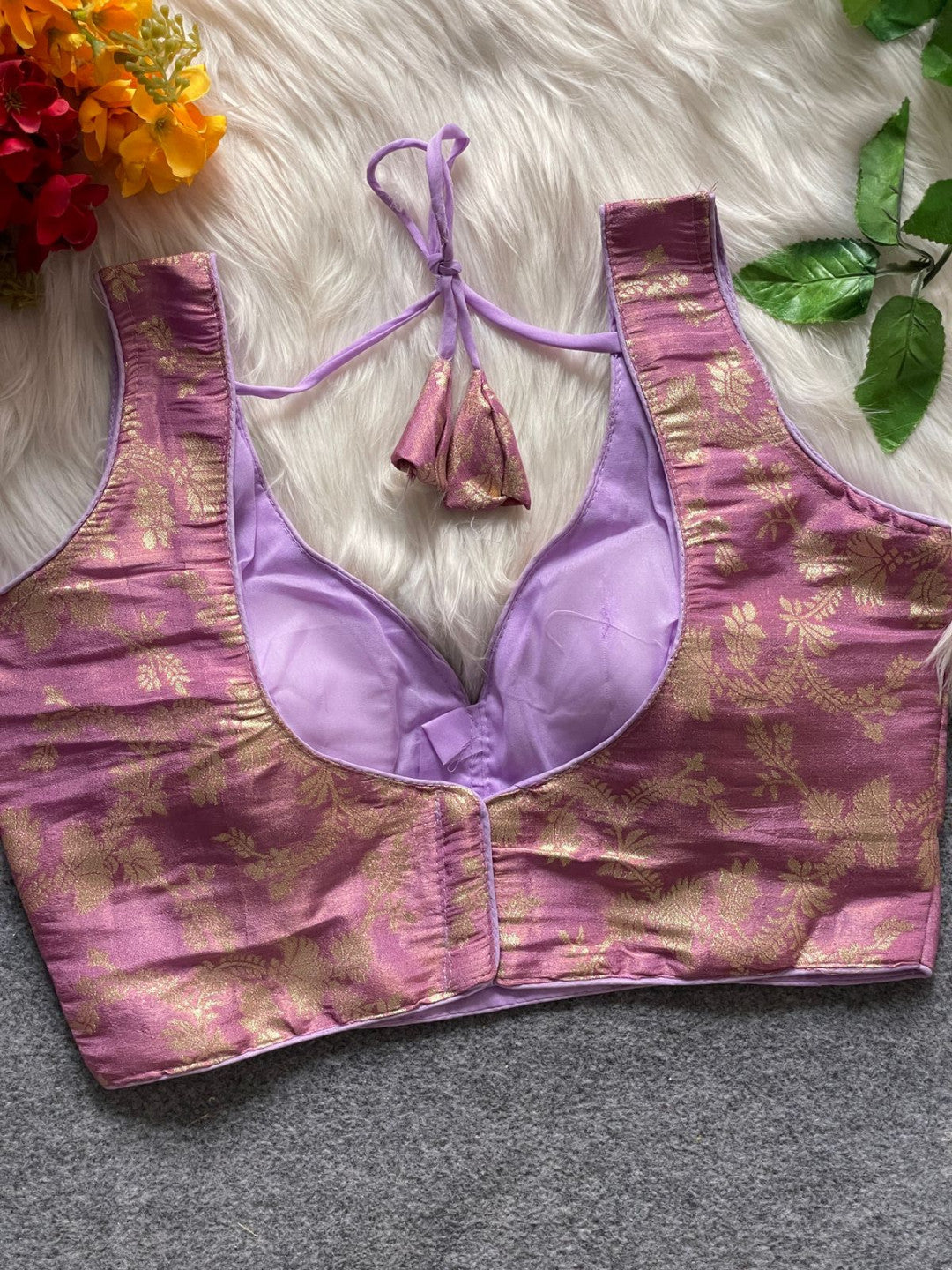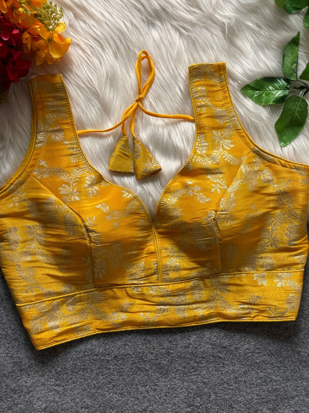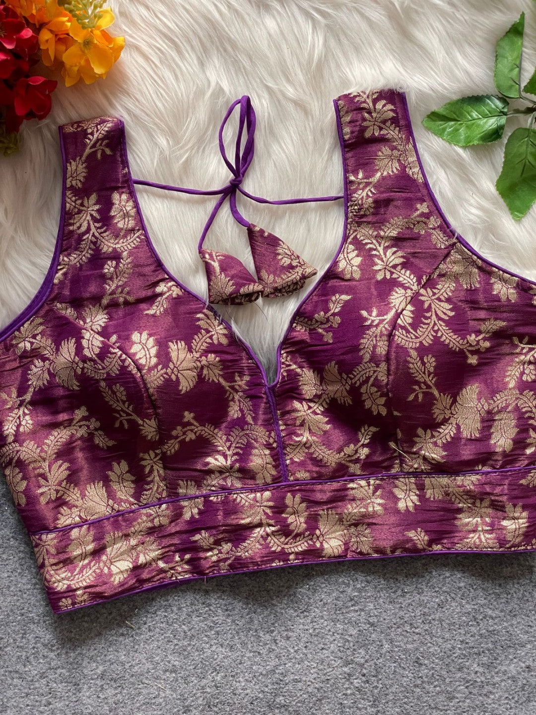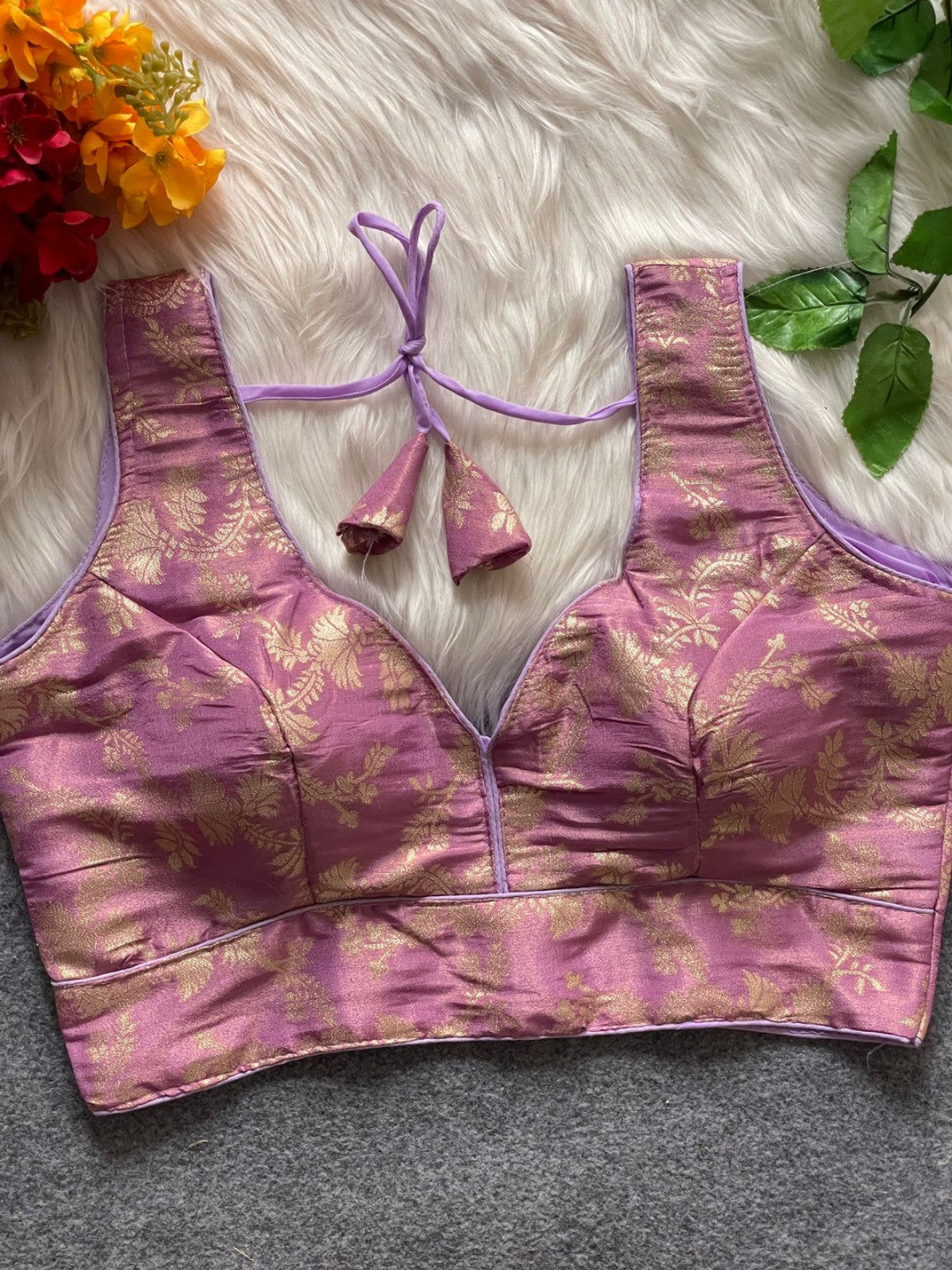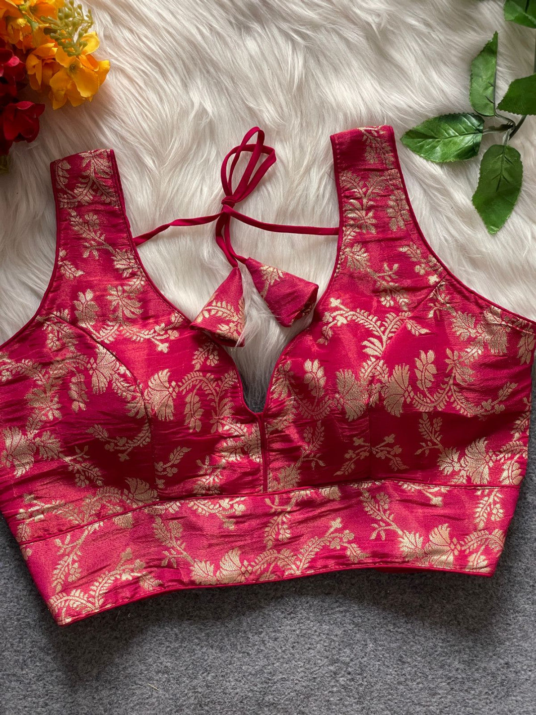 Fabric: Jequard Stitch type: Full stitched Work : Zari work Sleeves size: 10 inch in Side Attached Size: Free size 38 inch ready ulter upto 42 inch Back side: Back with hooks Pattern: V neck Pad: Yes padded.