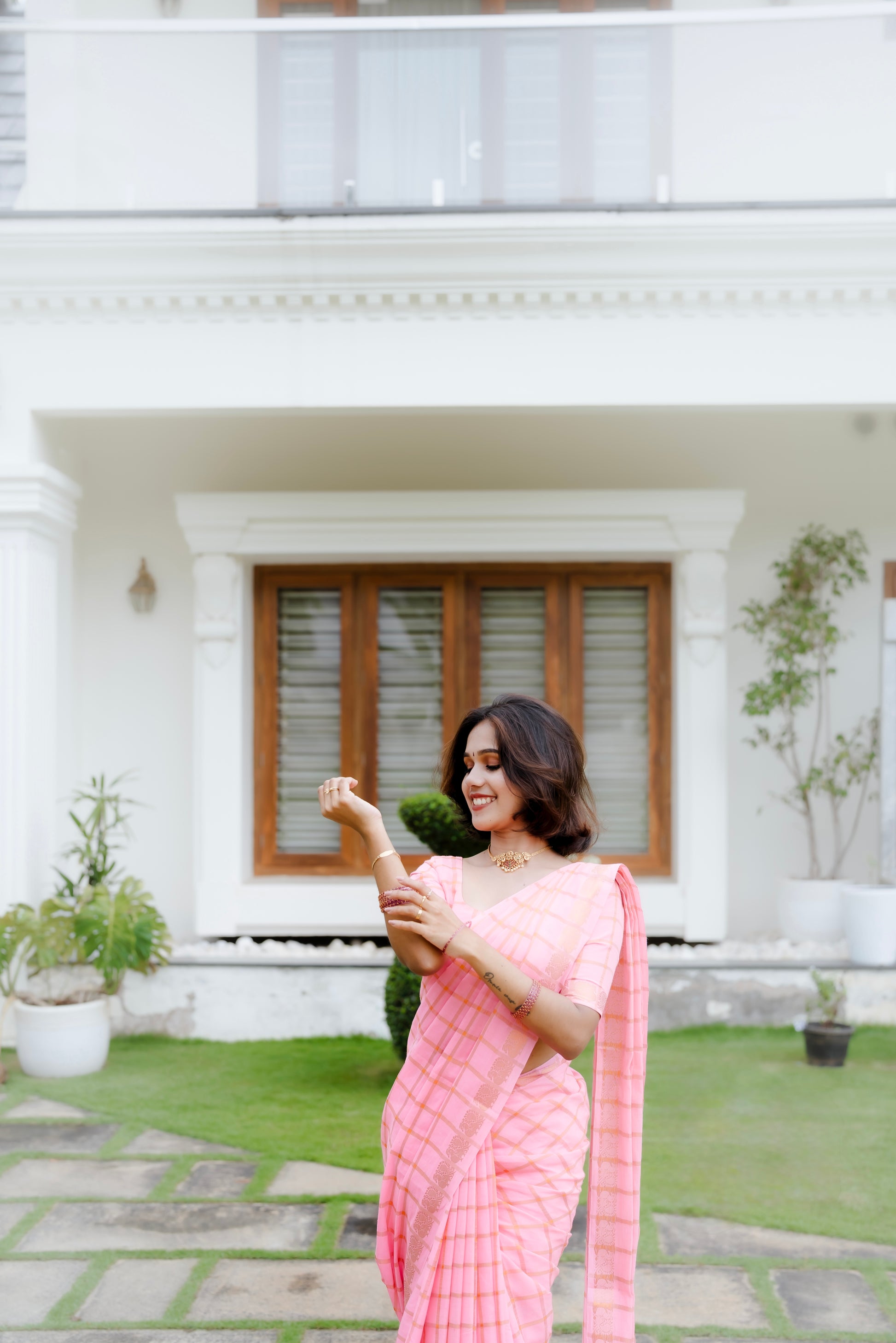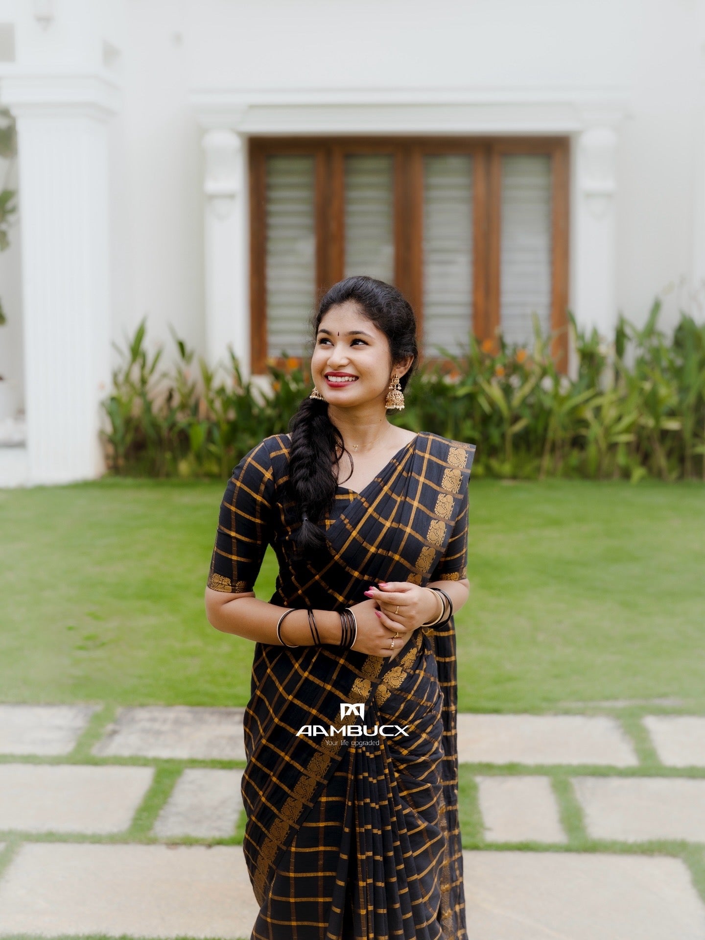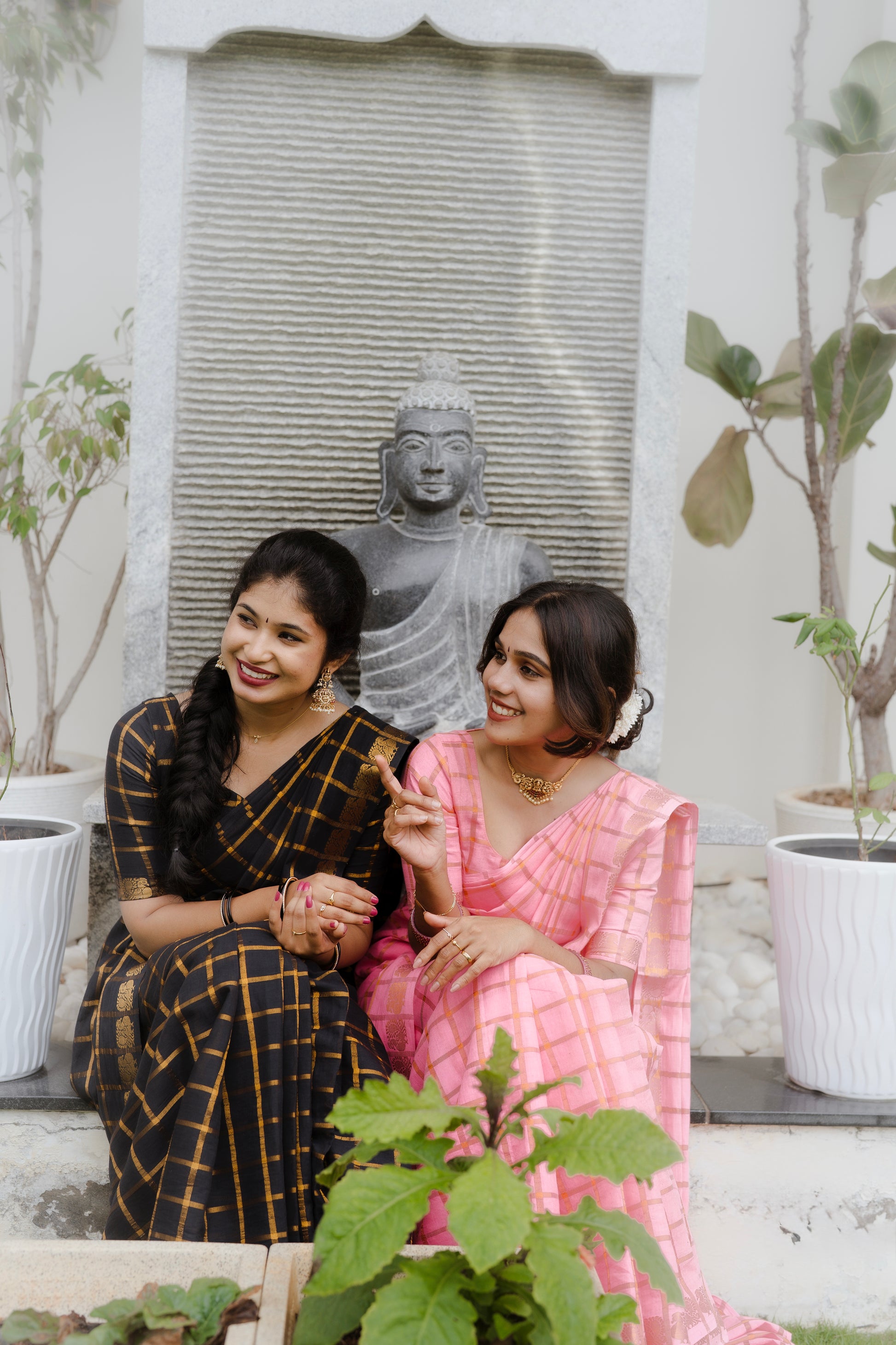 Elegant black with golden and pink with golden pavithrakattam saree with soft drape and traditional zari detailing.
