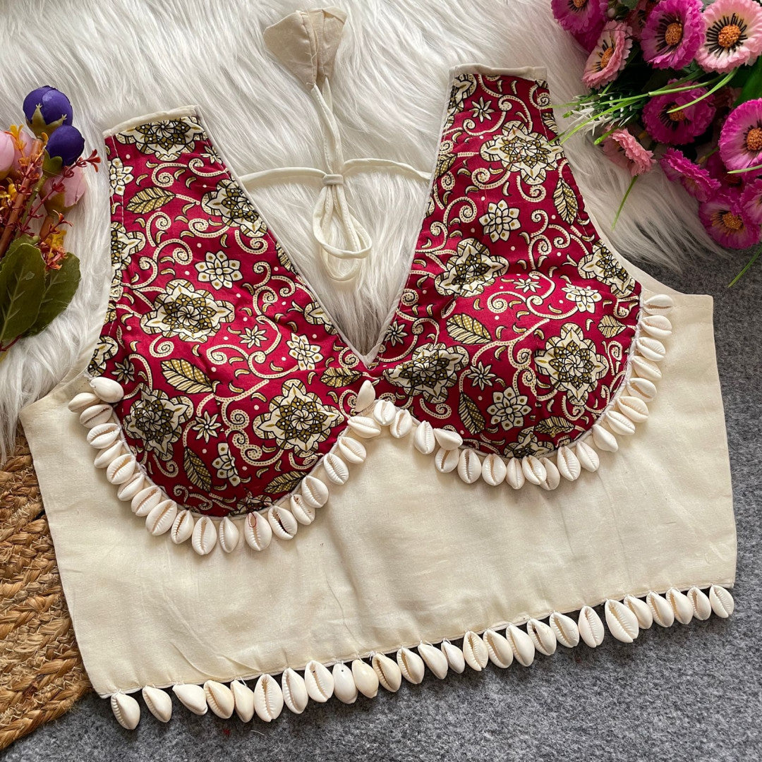 White Khadi cotton ajrakh printed readymade blouse with real shells.