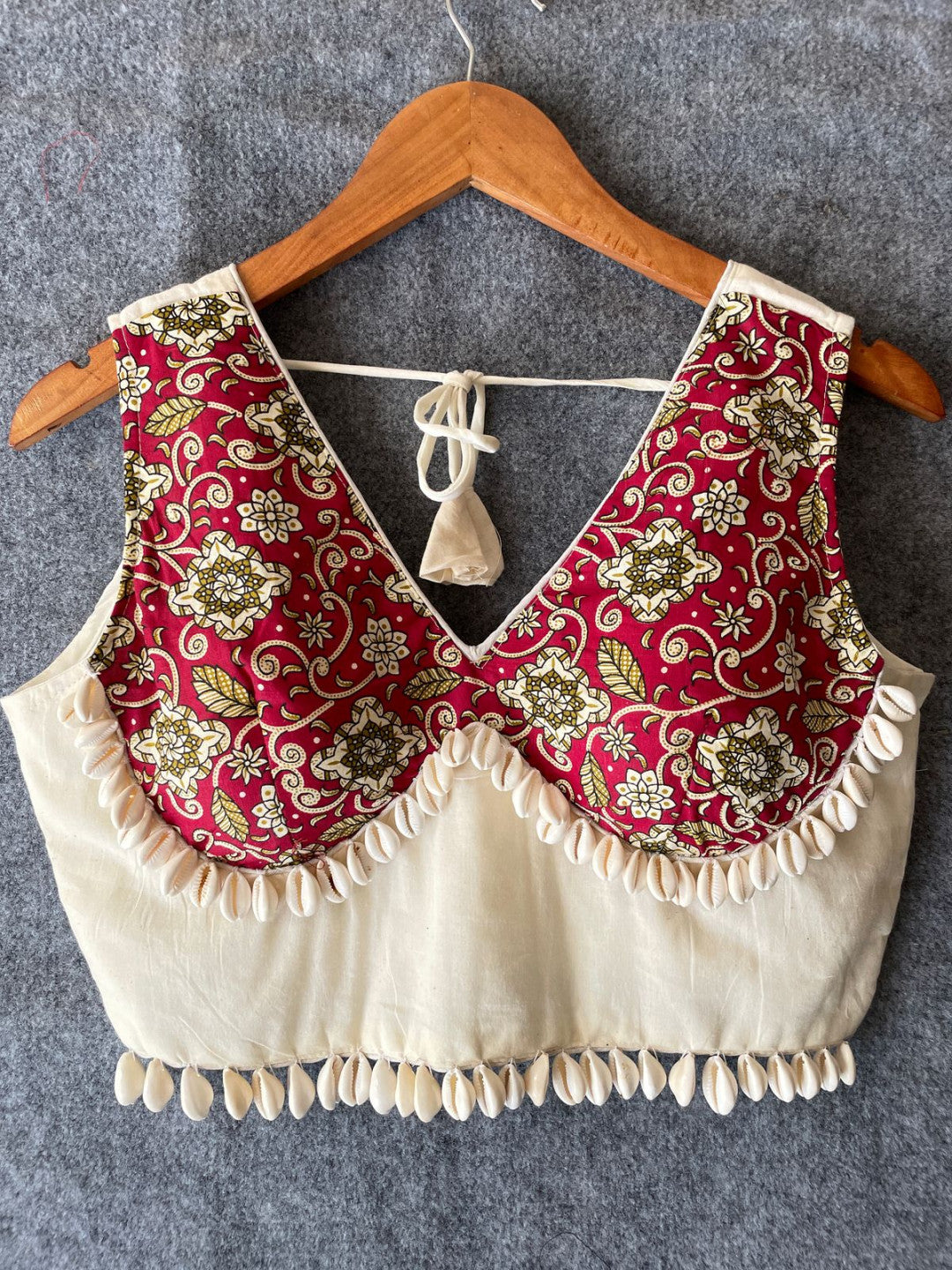 White Khadi cotton ajrakh printed readymade blouse with real shells [Product code:-
